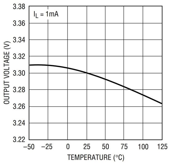 It can be seen from Equation (1) that the amplitude of the driving signal is proportional to the amplitude of the output signal when all other factors in the system are held constant. The amplitude of the driving signal is determined by the amplitude of the positive voltage power supply. The output amplitude of the power supply will change with temperature, and when the temperature changes, the amplitude of the driving signal will also change. The linear relationship between the driving signal and the output signal ensures that the output signal will eventually be affected by temperature changes. Figure 7 shows that the output curve of a typical LDO power supply drifts as the temperature changes []. When the temperature changes from −40 °C to +50 °C, the amplitude of the power supply changes by 0.03 V. The 16-bit high-speed ADC, with a full-scale range of 2.5 V, will cause a change of 787 DN, although in the differential system we developed, the driving signals of the two sensor probes have the same trend and magnitude of amplitude, and the common mode interference is eliminated after subtraction. However, due to the nonlinearity of sensor factors, the differential signal obtained by the system will also be affected by the change in amplitude.