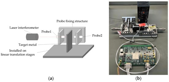 The process for setting up the test equipment was as follows. One sensor probe was fixed to the mount. Using the position of the sensor as the starting point, the laser autocollimator was used to adjust the position of the metal plate being tested with respect to the sensor, and when the desired distance had been set, the other sensor probe was affixed. The metal plate being tested was then centralized between the two probes. In the measurement experiment, we set the sensor–plate distances to 2.5 mm. The model of the laser interferometer probe used in this experiment was OMRON ZW-S20, which had a measurement accuracy of 20 nm and a measurement range of 20 ± 1 mm. The metal specimen to be tested was mounted on a micro-displacement platform, specifically the M-UMR8.25 model. The micro-displacement platform was equipped with a differential micrometer, which provided an accuracy of 0.1 μm.