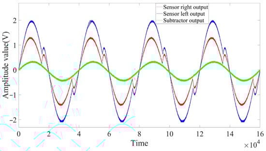 The clock signal after frequency division was input to the sensor coil, and the differential probe returned carrier signals with the same frequency but with different amplitudes, according to the difference in inductive impedance. One signal was subtracted from the other to produce the signal that was to be demodulated. In Figure 9, the red carrier signal was subtracted from the blue signal to give the green signal that was demodulated, and the three signals had the same frequency.
