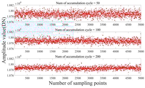 We maintain the stability of the object under examination and vary the accumulation cycle in the algorithm to analyze the output data of the system. Figure 10 shows the static stability of the system. This is consistent with the conclusions of the previous analysis. The accuracy of the system output was proportional to the number of accumulation cycles, and as the number of accumulation cycles increased, the convergence of the calculated points on the Y-axis increased. However, the number of accumulation cycles was inversely proportional to the speed of updating the demodulation data. In actual use, compromises have to be made according to the operating conditions.