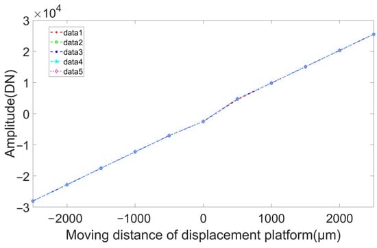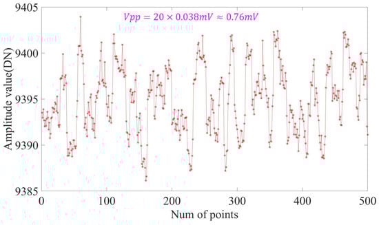 When the measured target was kept fixed, 500 points were intercepted from the stable output signal of the system to determine the sensor’s resolution. The measurement accuracy of the sensor was calculated using Equation (29); sensitivity was the data resolution error []. The range of the high-speed ADC was 2.5 V, and we calculated the sensitivity of the sensor with a range of 2.5 mm as an example.