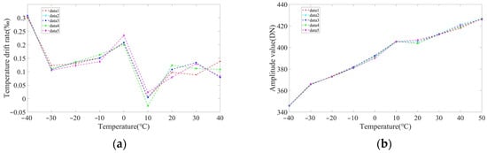 It can be seen from Figure 14 that as the temperature changed from −40 °C to +50 °C, sensor output at the same measurement position changed by 81 DN and the output change rate due to temperature drift was 0.12%, and the temperature drift was ±0.00137% FS/°C. This was a significant improvement in temperature drift performance by the sensor. For every 10 °C change in temperature, the temperature drift rate of the output amplitude was 0.029% at the maximum and 0.0004% at the minimum. At room temperature, the rate of change in temperature drift for every 10 °C was <0.01%.