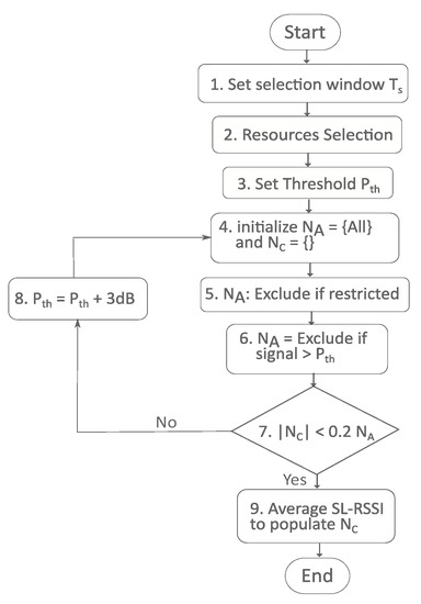 - Selection of potential resources: every vehicle organizes its available resources () according to sensing measures, and the resources are chosen by the following rules: (i) the SL-RSSI of the selected resource must be lower than a predetermined threshold agreed by the vehicle); (ii) if the resource is not detected during , it must not be chosen; (iii) out of all the resources accessible, no resources may be chosen that are already reserved; (iv) a vehicle cannot sense the channel when transmitting following a half-duplex transmission; and (v) the threshold is raised by 3 dB and the two-step exclusion process is repeated if the remaining candidate resources represent less than of the total amount of resources .