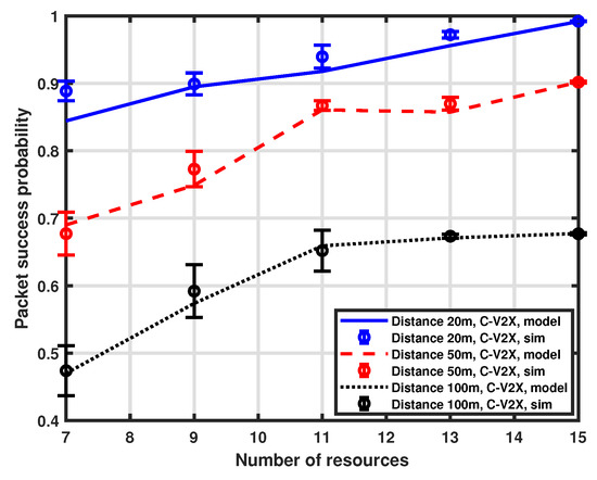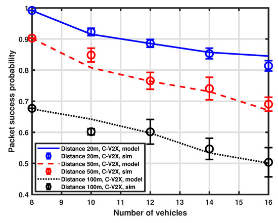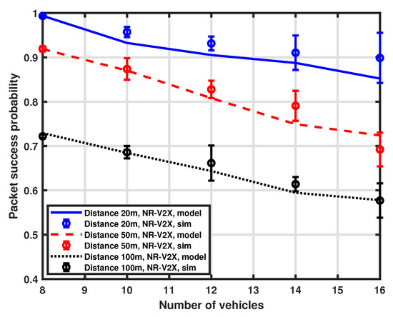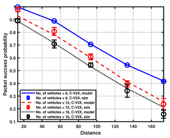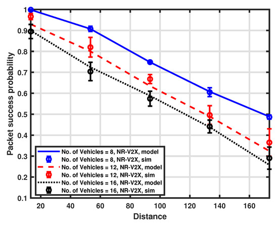 The packet success probability is also examined for the separation of the distance between the transmitter and receiver for a fixed number of resources in the selection window, which is set to 8. Different platoon sizes are considered by setting the number of vehicles to 8, 12, and 16, respectively. The validation of the proposed approximation model is illustrated in Figure 9 and Figure 10, while the comparison between LTE-V2X and NR-V2X is shown in Figure 11.