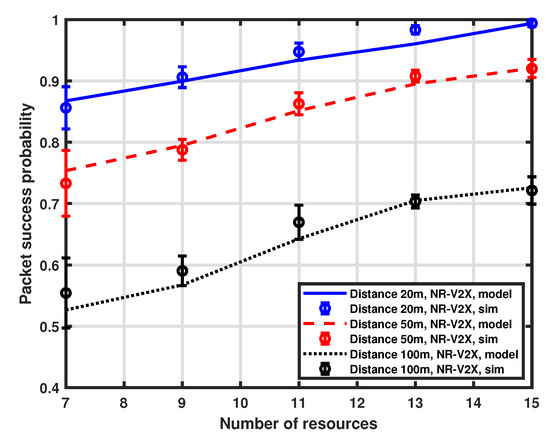 To verify the accuracy of the proposed approximation rationale as described in Section 4, extensive Monte Carlo simulations using MatLab are also performed for both NR-V2X and LTE-V2X, generating independent channel realizations for each vehicle and packet transmission attempt. Performance is evaluated in terms of packet success probability by changing the number of interfering vehicles, the number of resources (i.e., the number of transport blocks in a selection window), and the separation between the transmitter and receiver. At each data point for the simulations, the standard deviation is also displayed as a vertical error bar.