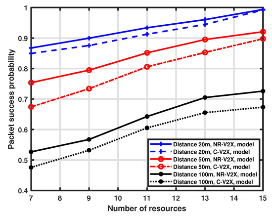 The performance of the NR-V2X is also compared with that of the LTE-V2X in Figure 8. As expected, the probability of success increases as the number of available resources increases. This is because, for a fixed number of interfering vehicles, the increase in available communication slots in the selection window implies a reduced impact of interference. It is to be noted that, when the number of resources is equal to the number of vehicles (i.e., 15), each vehicle has the option to reserve a dedicated communication slot, so interference does not affect the performance, which is mainly determined by the distance between the tagged vehicle and the platoon head. Finally, we observe that the NR-V2X provides a higher success probability than LTE-V2X.