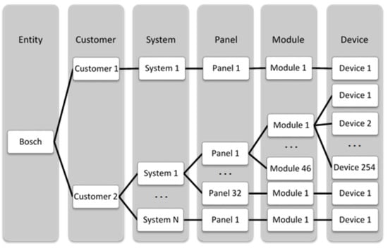 Figure 1 presents the general structure of the fire alarm system. For each Bosch customer, having a nonlimited number of systems is possible. Each system can have a maximum of 32 panels, and each panel can have a maximum of 46 modules. Each module can also have loops.
