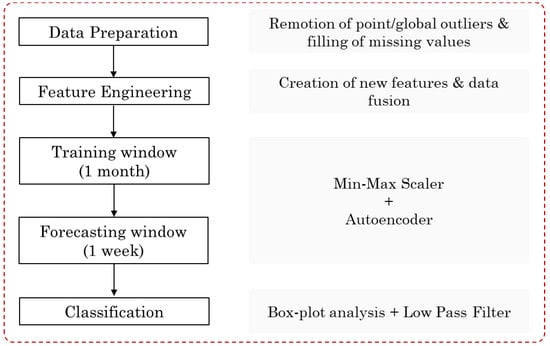 The approach comprises the following main steps, depicted in Figure 2: data preparation, feature engineering, training an autoencoder with one month of data, using it to forecast the following week, and classifying each example as normal or abnormal. We elaborate on each of these steps next.