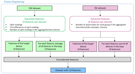 In a similar manner in which the features were extracted from the CM dataset, the features extracted from the RA dataset were created for the target device and for all devices in the loop (excluding the target device). Therefore, four features were extracted from the RA dataset representing the target device and four features representing the loop of the target device. The features representing the loop were obtained by summing all the features of the devices in the loop (except the target device). Figure 3 depicts a flowchart of the feature-engineering stage for the default parameters of the pipeline.