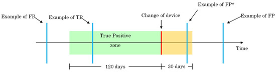 - True positive (TP): if there is an alert 120 days before the actual change of device;