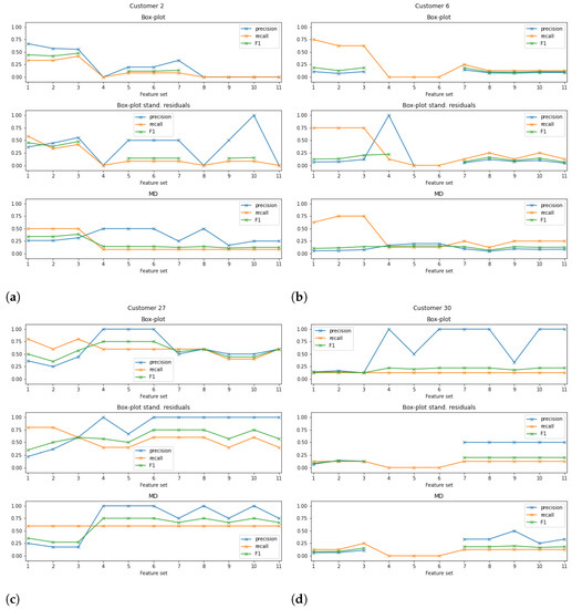 Performance results obtained for customers (a) Cust2, (b) Cust6, (c) Cust27, and (d) Cust30. Results present the precision, recall, and F1-score obtained with the 11 feature subsets used for classifying training window of 30 days and box plot analysis without standardisation of the reconstruction errors; box plot analysis with standardisation of the reconstruction errors; and Mahalanobis distance (MD) with the threshold computed for the 0.99 quantile.