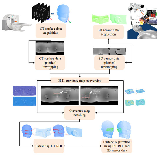- Kwon, K.H.; Lee, S.H.; Kim, M.Y. A patient-to-CT registration method based on spherical unwrapping and HK curvature descriptors for surgical navigation system. In Proceedings of the 2017 IEEE International Conference on Multisensor Fusion and Integration for Intelligent Systems (MFI), Daegu, Republic of Korea, 16–18 November 2017; pp. 1–6. [Google Scholar]