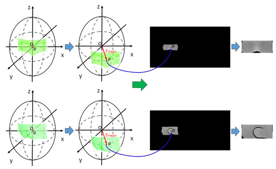 The center coordinates of the 3D CT data are obtained by calculating the average coordinates of all the 3D CT data points. Assuming that this center coordinates represent the center of a sphere, the 3D CT data are translated in parallel so that the origin of the coordinate system is located at the center of the 3D CT data to perform spherical coordinate system transformations. The process of mapping 3D CT data to a 2D image is performed using Equations (1)–(3). As shown in Equation (1), distance between the center point (origin) and each point of 3D CT data is used as the image intensity value. , obtained from the X- and Y-coordinate values of each point , is the width coordinate of the image, and , obtained from the Z-coordinate value and value of each point , is the height coordinate of the image, as shown in Equations (2) and (3). All values are mapped to the calculated width and height coordinates of the transformed image. This image projection process shows how points in the 3D CT data are transformed into a 2D image in Figure 2 using the spherical unwrapping conversion equation. To obtain an unwrapped CT image at the desired resolution, and are multiplied by the target resolution value, respectively. Figure 2 also shows the result of spherical unwrapping on 3D CT data, and the unwrapped CT image is a one-channel depth image.
