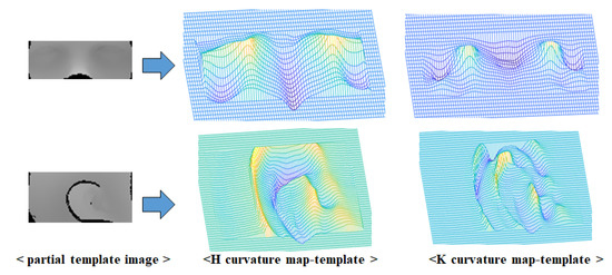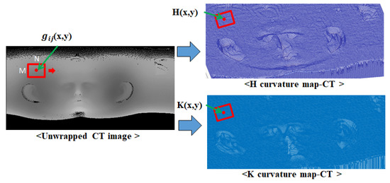 Curvature refers to the rate of change indicating the extent to which a curve or a curved surface deviates from a flat plane. Principal curvature refers to the maximum and minimum curvatures among the curvatures on a curved surface. Mean (H) curvature represents the average value of principal curvature, while Gaussian (K) curvature represents the product value of principal curvature. Both curvatures are commonly used for surface shape classification [29]. Since these curvatures are only determined by the surface form, such curvature features are robust to rotation, translation, and even some deformation. As the depth values of 3D scan data can be primarily affected by noise and variations in head poses during scanning, a robust image using a characteristic of curvature is necessary. The intensity of the unwrapped image for 3D CT data and 3D scan data represents the distance between the origin of the coordinate system and the corresponding point. Thus, this value can represent the surface shape of 3D data, and the H curvature and K curvature of the corresponding image coordinates can be obtained by calculating the partial differentiation using the N × M mask operation on the image intensity [30]. This method allows robust curvature features to be extracted from the unwrapped image.