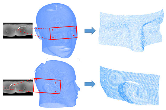To address this issue, the 3D scan data are also mapped to the 2D image using spherical unwrapping and other techniques. Although the 3D scan data are planar, they can be aligned with the axis of the 3D CT data, and the of the 3D CT data, as the average radius of the sphere, can be used to roughly place them on the spherical surface of the 3D CT data, as shown in Figure 3. In the same way, 3D scan data can also be mapped to the 2D image using spherical coordinate system conversion. Once the 3D scan data are placed on the spherical surface of the 3D CT data, spherical unwrapping is performed to generate an image on a scale similar to that of the unwrapped CT image. The 3D scan data are the partial area data of the head, and they are only mapped to a portion of the whole image. To ensure accurate image matching, only the area where the 3D scan data are mapped is extracted as a template. Figure 3 shows the results of template extraction in the unwrapped 3D scan image corresponding to the nose and right ear.