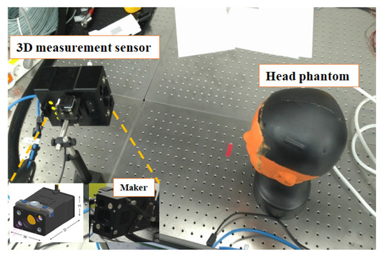 Figure 9 shows the experimental environment. As shown in Figure 9, a head phantom was used instead of a human head in the experiment. The 3D sensor was used to measure the surface of the natural features of the head phantom, such as eyes, nose, and ears, and the 3D CT data had the entire surface information of the head phantom. The 3D scan data consisted of approximately 20,000 points, and the 3D CT data consisted of approximately 350,000 points. The proposed algorithm was implemented using MATLAB.