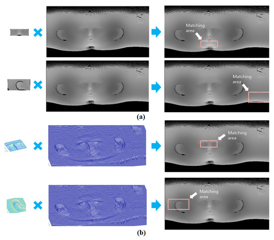 In the proposed method, the depth image obtained using spherical unwrapping is converted into a curvature image. Then, matching points are obtained to extract the CT ROI using curvature image matching. Although the conversion process is cumbersome, it is an essential step for robust image matching using the characteristics of the curvature image. To prove this, as shown in Figure 10, image matching between depth images before conversion and image matching between curvature images were performed using NCC, respectively. The results of depth image matching are shown in Figure 10a, where matching failed due to the large difference in intensities between 3D scan data and 3D CT data. In contrast, matching performed on curvature images was successful and accurate, as shown in Figure 10b. These experimental results show the fact that curvature image matching is more robust than depth image matching.