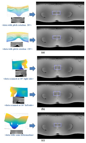 Matching between depth images was not performed properly due to their sensitivity to changes in intensity caused by holes, rotations, and translations that occur during the unwrapping process. In contrast, curvature image matching uses calculated curvature as a relative relation of surrounding image intensity values. This means that some degree of rotation and translation, and even some deformation, can be ignored. Furthermore, by only emphasizing the targeted natural feature, robust image matching can be achieved. Figure 11 shows additional experimental results of curvature image matching. It can be seen that curvature image matching works well even if there is some deformation or rotation that can occur during the scanning process in 3D scan data.