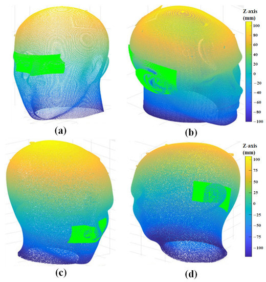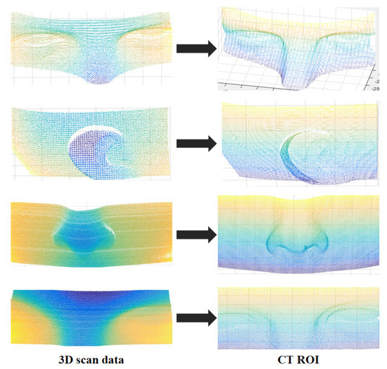 Four matching points are obtained with curvature image matching, and these points are then converted into 3D points to extract the CT ROI based on the coordinates of the converted points. In this experiment, 30 sets of 3D scan data obtained with the 3D measurement sensor were used for CT ROI extraction. The accurate matching result of the proposed method ensures the precise extraction of the CT ROI. Part of the CT ROI extraction experimental results are shown in Figure 12.