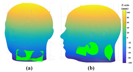 Coarse registration is a rough matching process that involves an approximate alignment of two data based on a proper initial location for the ICP algorithm. Using the ICP algorithm without this process can lead to convergence to a local minimum and failure of the matching process. In this study, the CT ROI, which is extracted in advance, is used instead of the entire 3D CT data to precisely match the 3D scan data using the ICP algorithm. This improves the computational speed of the ICP algorithm and makes matching more accurate because the local minimum problem is avoided at the time of matching. Figure 8 shows the results of matching two data using the ICP algorithm. The green point represents the 3D scan data, and the remainder is the CT ROI. Since the extracted CT ROI is used to provide the proper initial location for the ICP, coarse registration is not essential. However, for the stability of data matching, coarse registration is performed between two data before ICP matching. Then, as shown in Figure 8, the two 3D data are matched using the ICP algorithm.