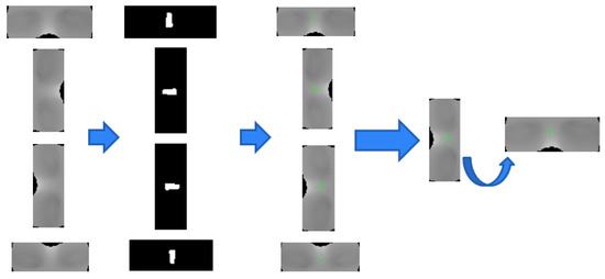 Figure 15 shows the nose vector obtained by extracting the nose region, which is an elliptical convex, using the surface shape classification of H-K curvature in the curvature image of 3D scan data. The extracted nose region is represented as a binary image to simply verify the extraction. The nose vector was obtained using the maximum–minimum value and the rate of change in the intensity values of the unwrapped image corresponding to the nose region. In the unwrapped CT image, the nose vector is always vertically upward. Therefore, aligning the nose vector of the template image with this vector before NCC allows data with roll rotation to be used in the proposed algorithm. This improvement can increase the degree of freedom and convenience for the user.