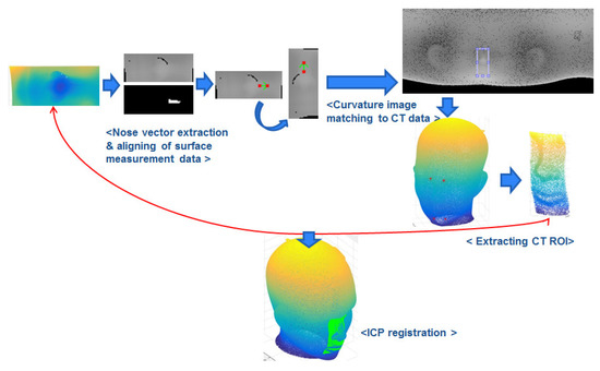 A 3D data precision matching algorithm is essential to transforming a patient’s 3D surface data and 3D CT/MRI data into a final coordinate system. Among several 3D matching algorithms, the iterative closest point (ICP) algorithm is the most representative and widely used one [20,21]. The ICP algorithm repeats the process of defining the closest points between two 3D data as corresponding points and minimizing the sum of the distances between the corresponding points for precision data registration. Conventional ICP algorithms without a proper initial location involve a lot of computation and can also suffer from incorrect matching results due to the local minimum problem [22]. The 3D data registration process can become faster and more accurate if a proper initial location is provided before performing the ICP algorithm. In this paper, a 3D registration method based on curvature matching to automatically find the proper initial location for the ICP algorithm is proposed in the head region for neurosurgery. This paper is an expanded version of the conference paper [23], and the basic concept can also be found in the conference paper. The proposed method utilizes the natural features of the skin surface, such as the nose and ears, eliminating the need for fiducial markers. The natural feature data are common between the patient and the CT/MRI image, and due to the relatively large rate of change in the data, these are easy to distinguish from other parts. Therefore, registration and matching errors can be reduced using these feature data. The proposed method finds the proper initial location for the ICP by converting 3D data to 2D curvature images and automatically performing curvature image matching. The proposed matching process is based on the characteristic that curvature features are robust to rotation, translation, and even some deformation [24,25]. To implement image-to-patient registration, the ICP algorithm between 3D CT data and 3D scan data is employed by utilizing curvature matching region information rather than the complicated 3D template matching methods [26,27].