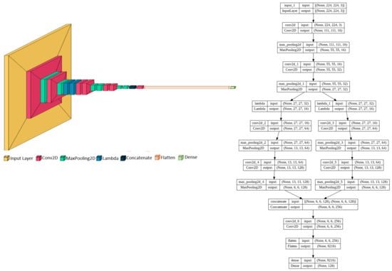 Overall, the architecture of our DCNet-Siam model consists of two embedding networks as the base models. Each embedding model contains a total of eleven layers; after two convolutional layers, we introduce one custom lambda block (CLB), one concatenation layer, one flattened layer, and one dense layer. The first convolutional layer uses 3 × 3@16 kernels, the second convolutional layer uses 3 × 3@32 kernels, the third and fourth convolutional layers use 3 × 3@64 kernels for both top and bottom groups, while the fifth and sixth convolutional layers use 3 × 3@128 kernels for the top and bottom branches. The seventh convolutional layer is added after concatenating the feature maps of the top and bottom layer branches. Max pooling is employed from the first to the sixth layer using 3 × 3 pooling and 2-pixel strides after batch normalization. However, the seventh layer is a convolutional layer without pooling and batch normalization. After the second convolutional layer, a custom lambda layer is used to split the feature map in half into 16 × 16. After the 7th convolutional layer, the multi-dimensional inputs are flattened into a 1-dimensional vector with 9216 neurons, which is then passed to the fully connected layer with dropout regularization. The final fully connected layer, also called the embedding layer, extracts a feature vector of 128. The input to the DCNet model is a 3-channel RGB image with 224 × 244@3 resolution, containing a total of 1,941,222 neurons.