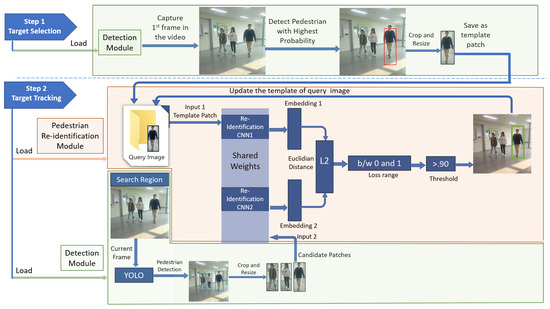 Figure 4 shows that our framework uses a tracking-by-detection approach in which we combine YOLO-based detection with our proposed Siamese-based re-identification models. Pedestrian detection was performed using YOLOv8 [73] while pedestrian verification in each frame was performed using proposed re-identification models for single pedestrian tracking.