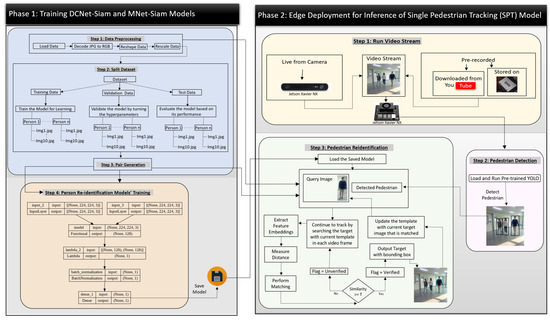 Figure 5 shows the workflow diagram of our SPT framework, which consists of two phases. The first phase is divided into two steps in which the first step performs data preparation, while the second step is training. Phase 2 represents the deployment workflow of our model on Jetson Xavier NX for single pedestrian tracking (SPT) in video streams to identify the target.