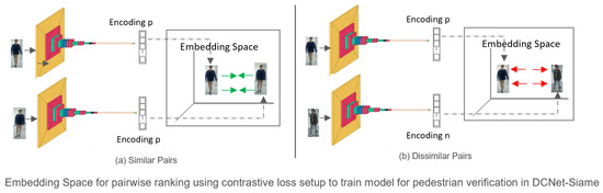 The selection of the right loss function is important because it significantly impacts the model explanation, interpretability, and its ability to fit the training images. For solving the pedestrian re-identification problem, we selected the distance metric learning-based contrastive loss shown in Equation (2) due to its ability to operate on data points directly instead of comparing classification results. This loss function matches the predicted and target output values of the pairs to determine how well the Siamese network can model the training data for distinguishing between image pairs. Training the model with this loss function requires a pair of positive and negative images. The objective of the contrastive loss is to embed the encodings in the latent space as shown in Figure 6 with a small distance for positive pairs and a large distance for negative pairs.