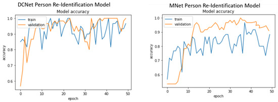Overall, the architecture of our MNet-Siam model consists of two MNet base models as embedding networks that take two input images as pairs and share the weights. Each embedding network outputs a 1D array with the desired size of a 128-dimensional feature vector, which is passed to the next layer for finding the distance between them. This layer is followed by batch normalization and a dense layer with a single unit for binary classification using the sigmoid activation function. The less similar pairs are represented with an output closer to zero, while the pairs with higher similarity are predicted with a value closer to one. This completes the person re-identification/verification network of our transfer learning-based MNet-Siam architecture.