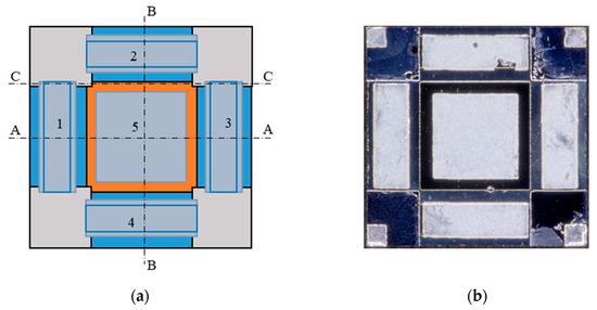 Chips of the TL-PSD devices were fabricated, flip-chip-bonded to sapphire carriers, mounted on a Peltier cooler, wired with thin gold leads to output pins, sealed in hermetic packages, integrated with read-out electronics, and scanned with a radiation spot. The chip-level layout used is shown in Figure 2, Figure 3 and Figure 4. Figure 2b provides a top-view micrograph of the fabricated chip. The direction of illumination is indicated in Figure 3. Table 1 schematically presents a diagram of the layers in the mesa structure, with their donor ND and acceptor NA doping concentrations, compositions, and thicknesses, in more detail than in the drawings. In the first column, n+ and p+ denote donor and acceptor, respectively, heavy doping in a narrow-gap HgCdTe; N+ and P+ denote donor and acceptor, respectively, heavy doping in a wide-gap HgCdTe; p− denotes acceptor light doping of the narrow-gap absorber. The net doping NA = 2 × 1015 cm−3 of the absorber is a result of subtraction of the background donor doping—ca. 8 × 1014 cm−3–from the actual arsenic concentration. The wide-gap layers, N+–contact for electrons–and P+–contact for holes—are interfaced to the absorber through the graded-gap HgCdTe layers. The CdTe passivation at the edge of the mesa is deposited by sputtering.