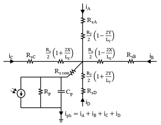 The equivalent circuits treat the TL-PSD like a four-way output current divider with four resistances. Their values can be approximated using the formulas written in Figure 6. The least error of such approximation is obtained at the center position of the light spot, with the radiation distribution approximated by Dirac’s delta function. Figure 7 shows a piece of the equivalent circuit suited for the finite element analysis—two adjacent cells of an array consisting of n × n equal cells. Rp denotes the differential parallel resistance and Cp denotes the differential parallel capacitance of the photodiode at a given reverse bias. The Rsh series resistance is the square sheet resistance of the resistive layer, and Rs com is the common series resistance, which is approximately the series resistance of the photodiode excluding the resistive layer. Both models are limited to the small signal case for which the input radiation power and the photocurrent are within the detector linear operation range.