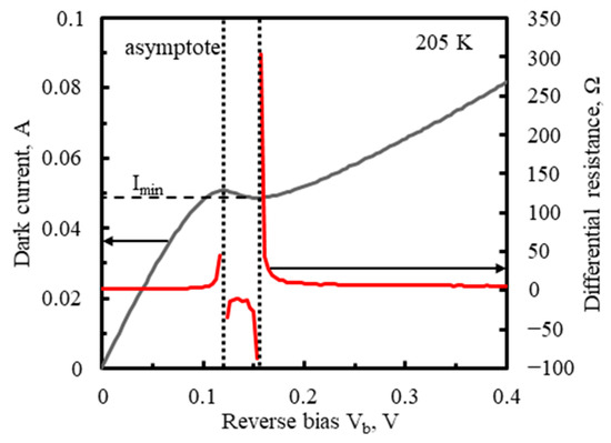 Dark I−V characteristics of the TL−PSD photodiode with the 10–11 µm long wavelength cut-off at Td = 205 K.