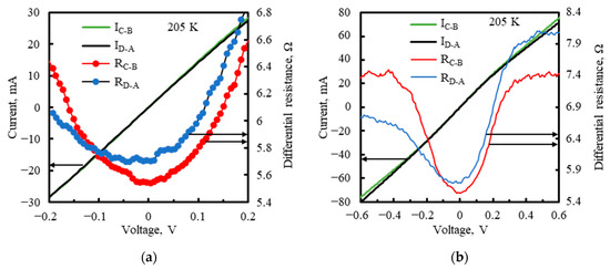 Current and differential resistance versus voltage between the opposite cathode electrodes. The DC measurement at Td = 205 K with the photodiode electrically open. RC-B denotes resistance between the electrodes C and B, and RD-A denotes resistance between the electrodes D and A. These are resistances measured between the respective output pins outside the PSD hermetic package minus the resistance 1.2 Ω of two thin 25 µm diameter golden lead wires, connecting the output pins with the cathode electrodes. (a) Results shown in the bias voltage range −0.2 V to +0.2 V. (b) The same, with added results in the greater bias range.