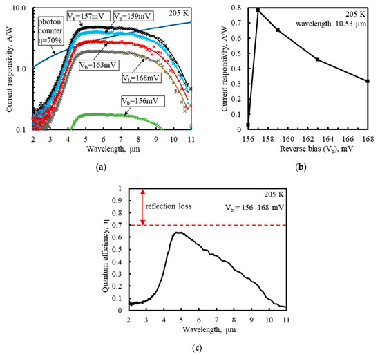 Spectral responsivity of the PSD photodiode at Td = 205 K, from the photocurrent at the anode common contact, measured with the Fourier transform infrared spectrometer for the various reverse bias voltages Vb: (a) spectral characteristics (adapted with permission from Ref. [20]; copyright: 2022, SPIE); (b) rapid change in the responsivity with Vb around 0.16 V; (c) spectral quantum efficiency η = ηr × ηa.