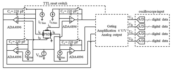 General scheme of the read-out electronic circuit suited to the PSD photodetector, with the switched integrating preamplifiers, current sources compensating the reverse bias current individually for each channel, and one voltage source ensuring the constant reverse bias voltage for all the four channels. The output voltage was measured with a sampling analog-to-digital converter of the oscilloscope input.