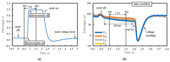 Reset-and-integrate timing with the sampling time instants M1 and M2 shown: (a) example waveform of the output voltage from one channel, when the detector was lighted with the 100 ns laser pulse; (b) waveforms of the output voltages from all the channels, A, B, C, and D, when the detector was shielded from radiation.
