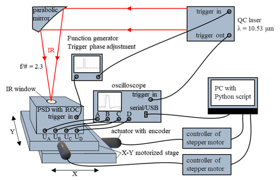 Two detectors, each with a separate PSD chip from the same wafer, were assembled and integrated with the read-out electronics, forming two compact samples of PSD modules #1 and #2. The modules were attached to a heat-sink, which helped in the electronic stabilization of the detector operation temperature with a precision of 0.01 K. The output voltage was measured with an oscilloscope and mapped across the photosensitive area in a setup shown in Figure 13.