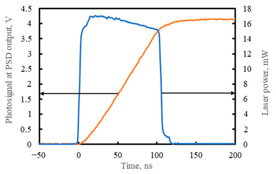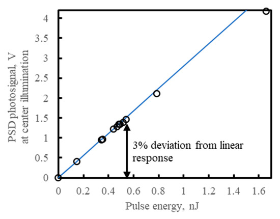 The data are summarized in Table 3. The position resolution of 3–6 µm without averaging was obtained using the τCDS interval of 1 µs and 0.26 nJ 100 ns radiation pulses. However, the photocurrent was actually integrated just during the 100 ns radiation pulse. For the radiation pulse wider than the applied CDS interval, the photocurrent was integrated 10 times longer, over the entire interval τCDS = 1 µs, and the signal-to-noise ratio also increased 10 times. Thus, the position resolution of this PSD is 10 times better, i.e., 0.3–0.6 µm.