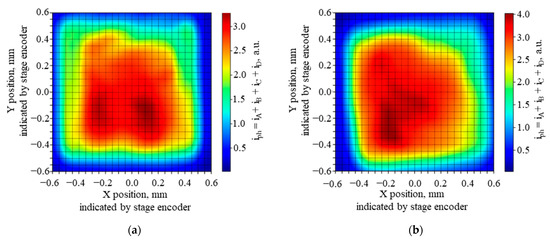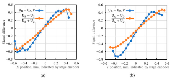 where XPSD and YPSD are the Cartesian coordinates of the radiation beam spot position determined from the TL-PSD signals, i.e., the UA, UB, UC, and UD voltages at respective channel preamplifier outputs. The preamplifiers integrate the photocurrent, giving the output voltage proportional to the input radiation pulse energy. The scale factors kX and kY are proportional to the resistance length L ≈ LX ≈ LY ≈ 1 mm (Figure 1). If the dark current of the photodiode is significant, kX and kY are also affected by the dark current and energy of the radiation pulses. In this case, for kX and kY to be constant, the radiation pulse energy should be constant too [7]. The resistance lengths LX and LY represent the linear size of the detector photosensitive area in the X and Y directions, respectively, where the TL-PSD signals change with the respective X and Y position shifts, preferably in linear proportion.