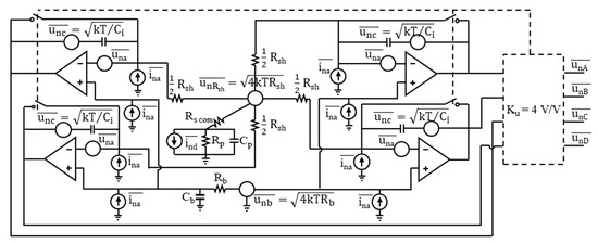 The inductance of the single lead wire can be assumed to be L = 13.3 nH, as the inductance of a straight gold wire 25 µm in diameter and 1 cm long [55,56]. For the applied integration times, which are time intervals τCDS of the correlated double sampling (CDS; Section 6), τCDS1 = 1 µs and τCDS2 = 0.5 µs, the 3 dB frequencies f of an integrating preamplifier transfer function are those of sinc(π τCDS f)—the Fourier transform of a rectangular pulse of τCDS width—f3dB1 = 0.44/τCDS1 = 440 kHz and f3dB2 = 0.44/τCDS2 = 880 kHz, respectively [57]. The impedance modules |ZL| of the wire introduced by the inductance L at f = f3dB1 and f = f3dB2 are |ZL1| = 2π × f3dB1 × L = 0.036 Ω and |ZL2| = 2π × f3dB2 × L = 0.072 Ω, negligible in comparison with 0.6 Ω of the wire resistance.