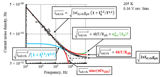 where i is the detector overall current or one of its components, Td is the detector operating temperature, and Vb is the detector bias voltage. According to Tobin et al., the surface generation and surface leakage could be modulated by fluctuations in the surface potential, thus generating the 1/f noise. The authors were inspired by numerous works on 1/f noise studied in silicon and germanium filaments, p-n junctions [41], and MOS transistors, including McWhorter’s suggestion in 1953 that variations in the occupancy of the slow surface states caused conductivity fluctuations of semiconductor filaments and had a wide uniform spectrum of relaxation times corresponding to the 1/f noise [35] (pp. 207–228). Single-electron slow trapping de-trapping generates random telegraph noise [42]. In photodiodes, the slow trapping events mainly occur in passivation near the semiconductor surface or in the dislocations intercepting the junction, both in depletion regions.