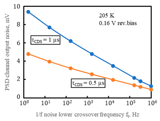 The output noise voltage estimated by Equations (11) and (12) for the integration time τCDS = 1 µs and 0.5 µs and for the several values of the 1/f noise lower crossover frequency fl (adapted with permission from Ref. [20]; copyright: 2022, SPIE).