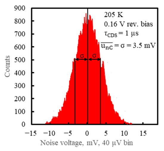 The output noise voltage measurement was carried out using the ROC and PSD connections from Figure 11 and a fast oscilloscope operated at 10 GigaSamples/second and 500 MHz bandwidth. The CDS technique described in Section 6 was used and no laser light was applied, so no photosignal was produced. Figure 25 is a histogram of the CDS voltages measured at τCDS = 1 μs and with the PSD operated at Vb = 0.16 V and Td = 205 K. The Gaussian-like distributions of the CDS voltage with its rms noises , , , and at the respective outputs were obtained. The measured values for the rms noise were 1.6 times greater than the output noise voltage estimated by Equations (11) and (12) for the same τCDS and conditions of PSD operation if fl = 1/(2π τCDS) was assumed, as in [64]. This is still reasonably good consistency between the measured and estimated noise values.
