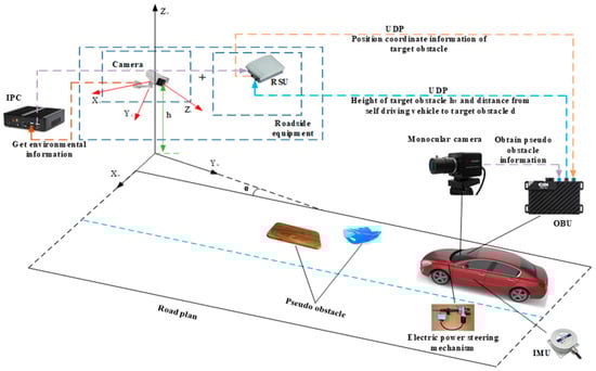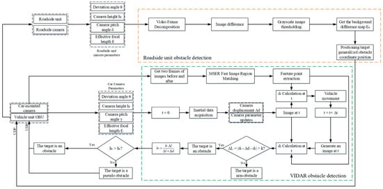 For the roadside unit detection environment view that cannot detect generalized obstacles which are near two-dimensional objects, this paper proposes an obstacle detection method based on the fusion of the roadside unit and vehicle-mounted camera. The roadside unit camera is used to obtain the road environment information (including the localization of generalized obstacles, the relative position relationship between obstacles, etc.). For the generalized obstacles that cannot be recognized by the roadside unit side, the obstacle detection method based on VIDAR can be used by the vehicle-side camera to determine the authenticity of the obstacles based on the height of the generalized obstacles. The vehicle-end camera can also detect the distance information before the self-vehicle and the target obstacle. Through the UDP protocol, the generalized obstacle authenticity and distance information are transmitted to the roadside unit end to improve the road environment information at the roadside unit end and provide the overview distance for subsequent vehicles. At present, the commonly used obstacle detection method is to obtain the camera motion parameters by using the sensor or motion estimation method and achieve obstacle detection by compensating for the camera motion [,,]. However, this method is less efficient and has certain errors in practical operation. In this paper, the generalized obstacle information acquired by machine vision is transmitted to RSU, and the data processing operation is completed in the computational unit of RSU. This method greatly improves the data processing efficiency and reserves time redundancy for subsequent operations, such as vehicle path planning and obstacle avoidance. The specific process of obstacle detection by roadside unit and vehicle camera fusion is shown in Figure 2.