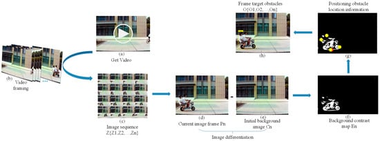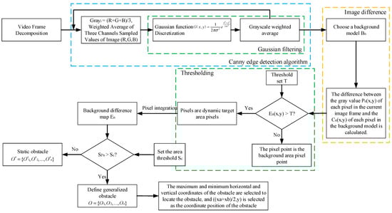 - Calculate the obstacle position coordinate and locate the obstacle position. False recognition of dynamic pixels is caused by the influence of external environment (light changes, wind speed, etc.). In this paper, we set the object change area threshold in two frames, where is the period step set by the image sequence. The generalized obstacle is defined by comparing the change area, where this obstacle vertical coordinate is the value of the lowest point vertical coordinate of the target obstacle. The obstacle horizontal coordinate is the arithmetic mean of the maximum horizontal coordinate value and the minimum horizontal coordinate value corresponding to the longitudinal coordinate of the lowest point of the target obstacle. Finally, the coordinate points corresponding to the minimum abscissa, the maximum abscissa, the minimum ordinate, and the maximum ordinate of the obstacle in the background difference image are extracted. The above four points are used as frames, and the frame area is the obstacle position area. Figure 4 is the overall flow chart of the RSU generalized obstacle extraction.
