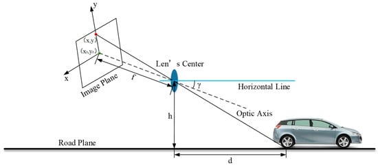 Obstacle image information acquisition is the process of mapping a target obstacle in a three-dimensional space to a two-dimensional imaging plane, which simplifies the vision sensor that detects generalized obstacle information to a pinhole camera model (see Figure 6). The effective focal length of the camera is , the installation height of the camera is , and the pitch angle of the camera is . The origin of the two-dimensional imaging plane coordinate system is , and the intersection of the image plane and the central axis of the camera is usually set to . The intersection point between the obstacle in front and the road plane is , and the coordinate of P point in the image plane coordinate system is . The horizontal distance between the point and the camera is