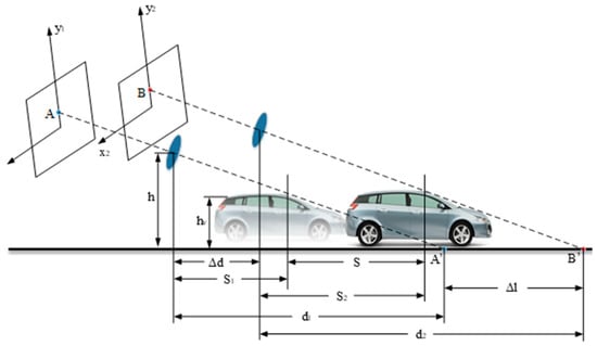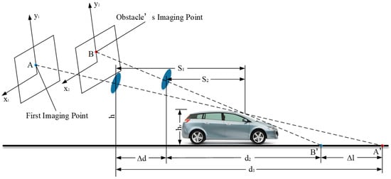 When the obstacle moves horizontally along the specified direction of the road (see Figure 8), the horizontal distance from the camera to the vertex of the obstacle at the previous moment is , and the horizontal distance from the camera to the same vertex of the obstacle at the next moment is ,. The relationship between and is