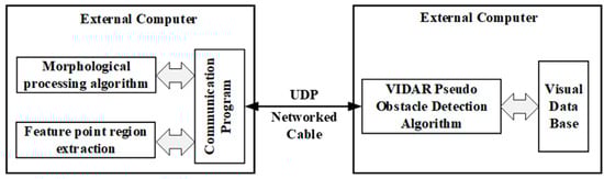 Since there is no ready-made program for UDP communication in the software, the communication client (RSU) program is written to receive and transmit data. The communication port architecture program is shown in Figure 11. A software program is run on an external computer at the RSU end, which provides morphological processing algorithms and feature area extraction algorithms. The obstacle location information generated by the feature area extraction algorithm is transmitted to the server (OBU) using the UDP protocol. A generalized obstacle detection algorithm based on VIDAR is provided on the external computer of the server. The communication port constructed using the UDP protocol transmits obstacle height information to the communication client.